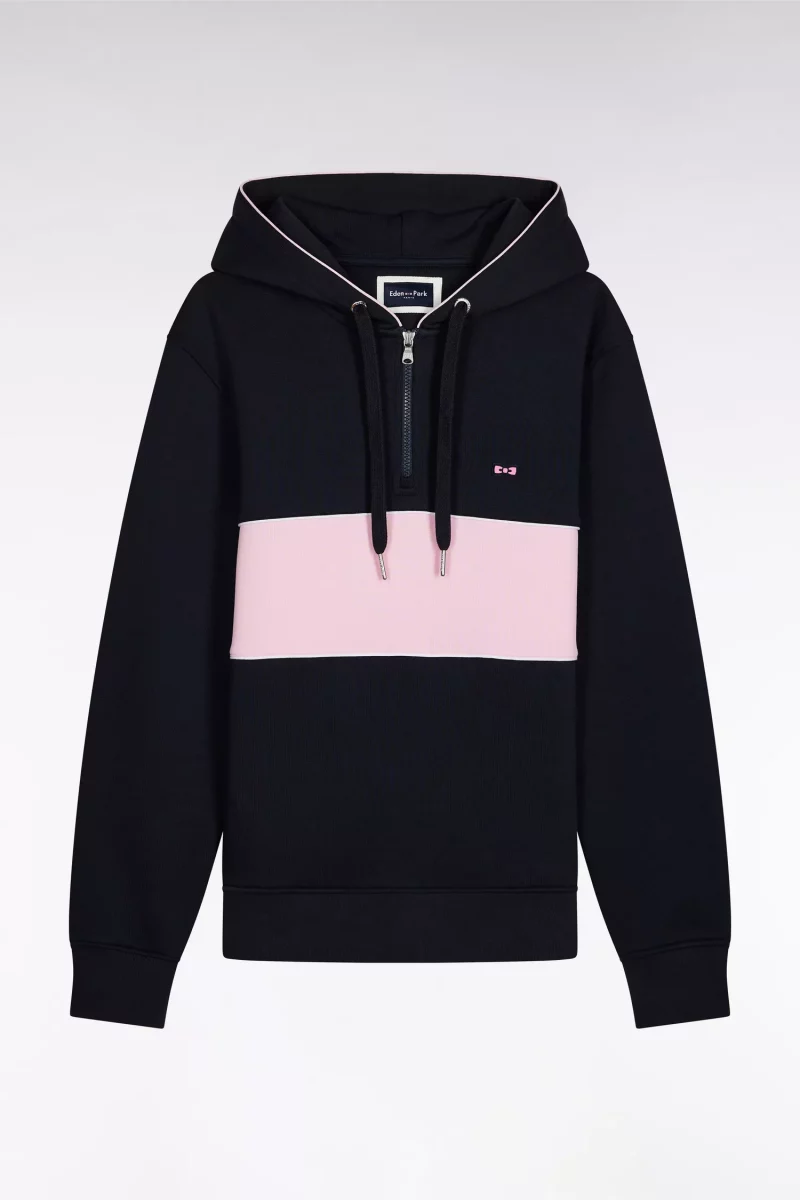 Pull Sweat Molleton Capuche Bande Bleu Fonce